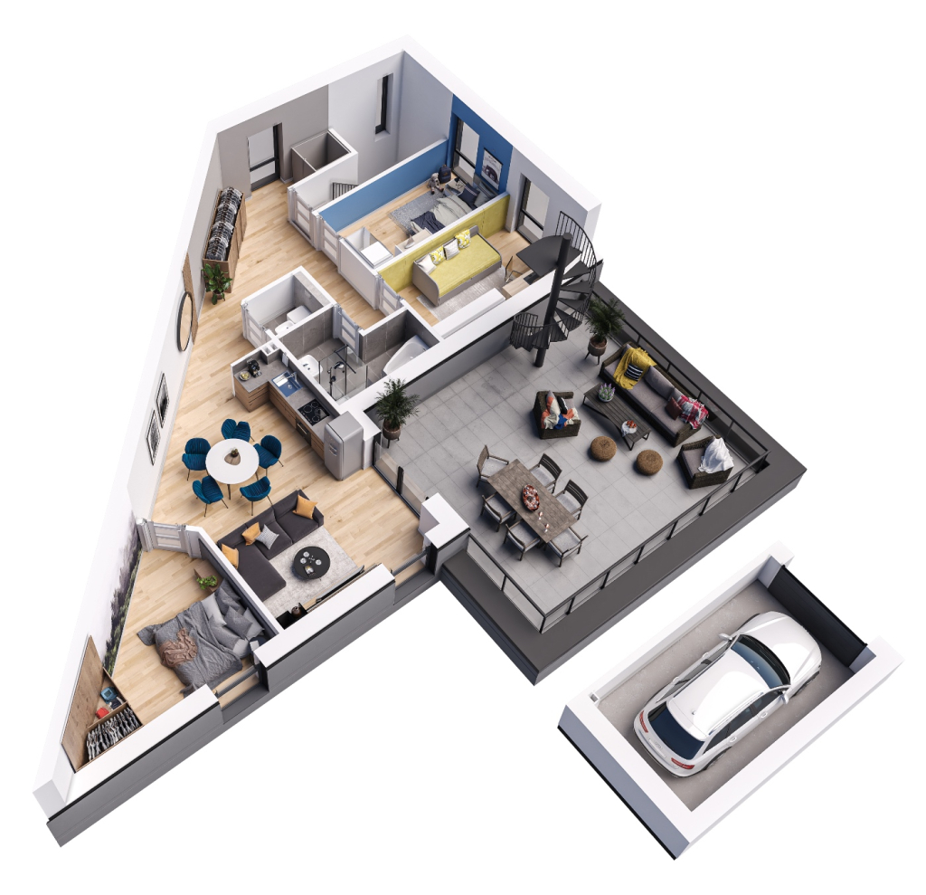 To nowoczesne mieszkanie o unikalnym układzie oferuje przestronne wnętrza i wyjątkowy komfort. Składa się z jasnej strefy dziennej obejmującej salon z aneksem kuchennym, trzech sypialni oraz funkcjonalnej łazienki i WC. Ogromnym atutem są dwa duże tarasy  idealne do relaksu i spotkań towarzyskich, a także prywatny garaż. Stylowe wykończenie, funkcjonalne rozwiązania oraz duże przeszklenia zapewniają wyjątkową atmosferę i maksymalne doświetlenie wnętrz. Idealne miejsce dla osób ceniących komfort i nowoczesny design!