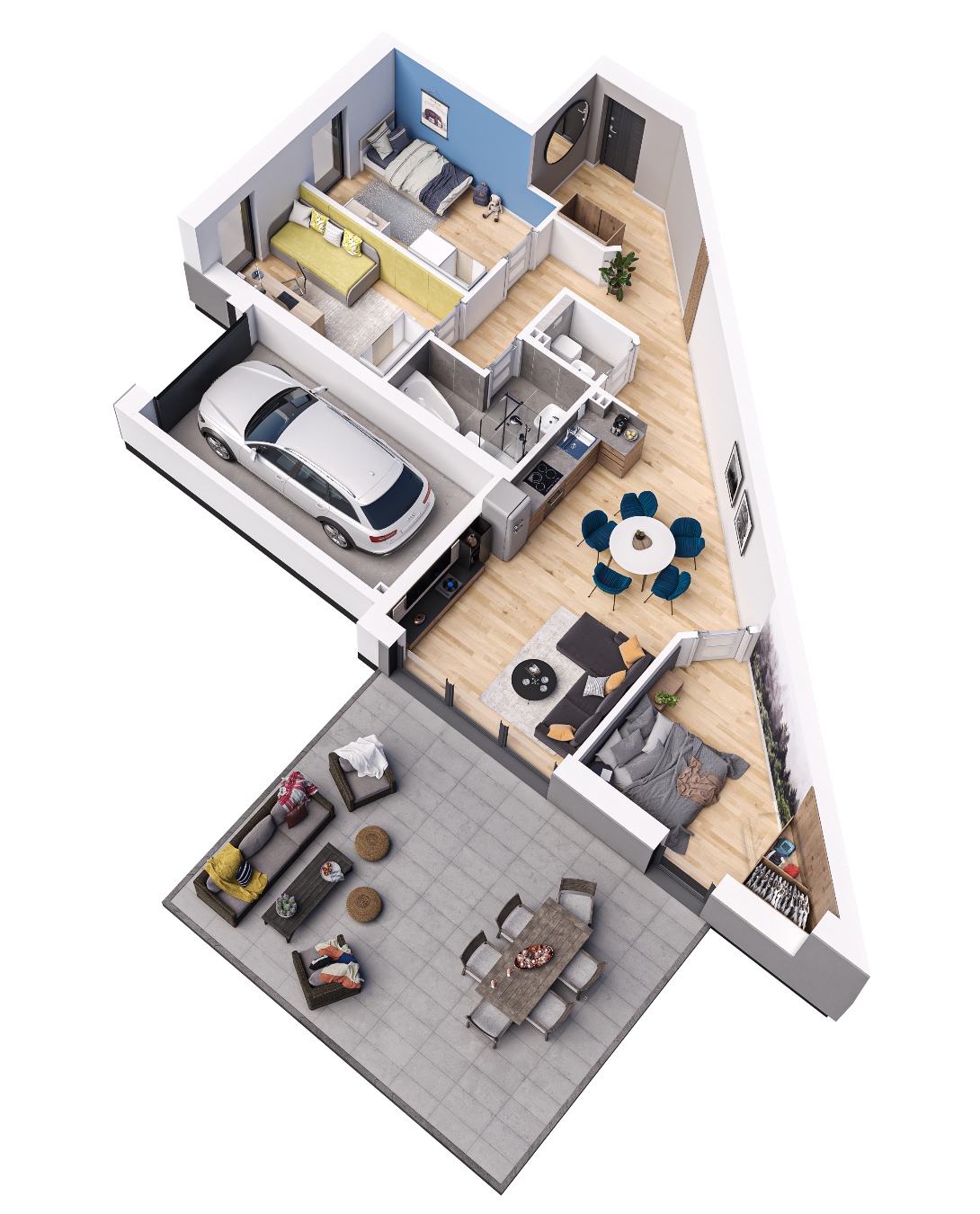 To nowoczesne mieszkanie o unikalnym układzie oferuje przestronne wnętrza i wyjątkowy komfort. Składa się z jasnej strefy dziennej obejmującej salon z aneksem kuchennym, trzech sypialni oraz funkcjonalnej łazienki i WC. Ogromnym atutem jest duży taras i ogród idealny do relaksu i spotkań towarzyskich, a także prywatny garaż. Stylowe wykończenie, funkcjonalne rozwiązania oraz duże przeszklenia zapewniają wyjątkową atmosferę i maksymalne doświetlenie wnętrz. Idealne miejsce dla osób ceniących komfort i nowoczesny design!